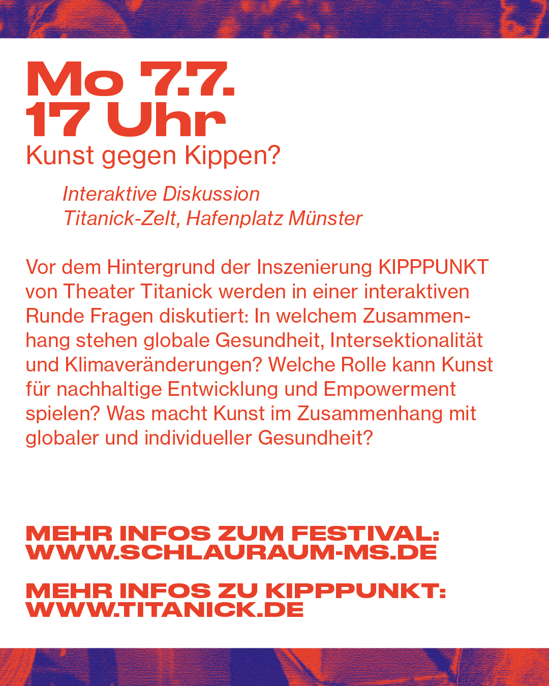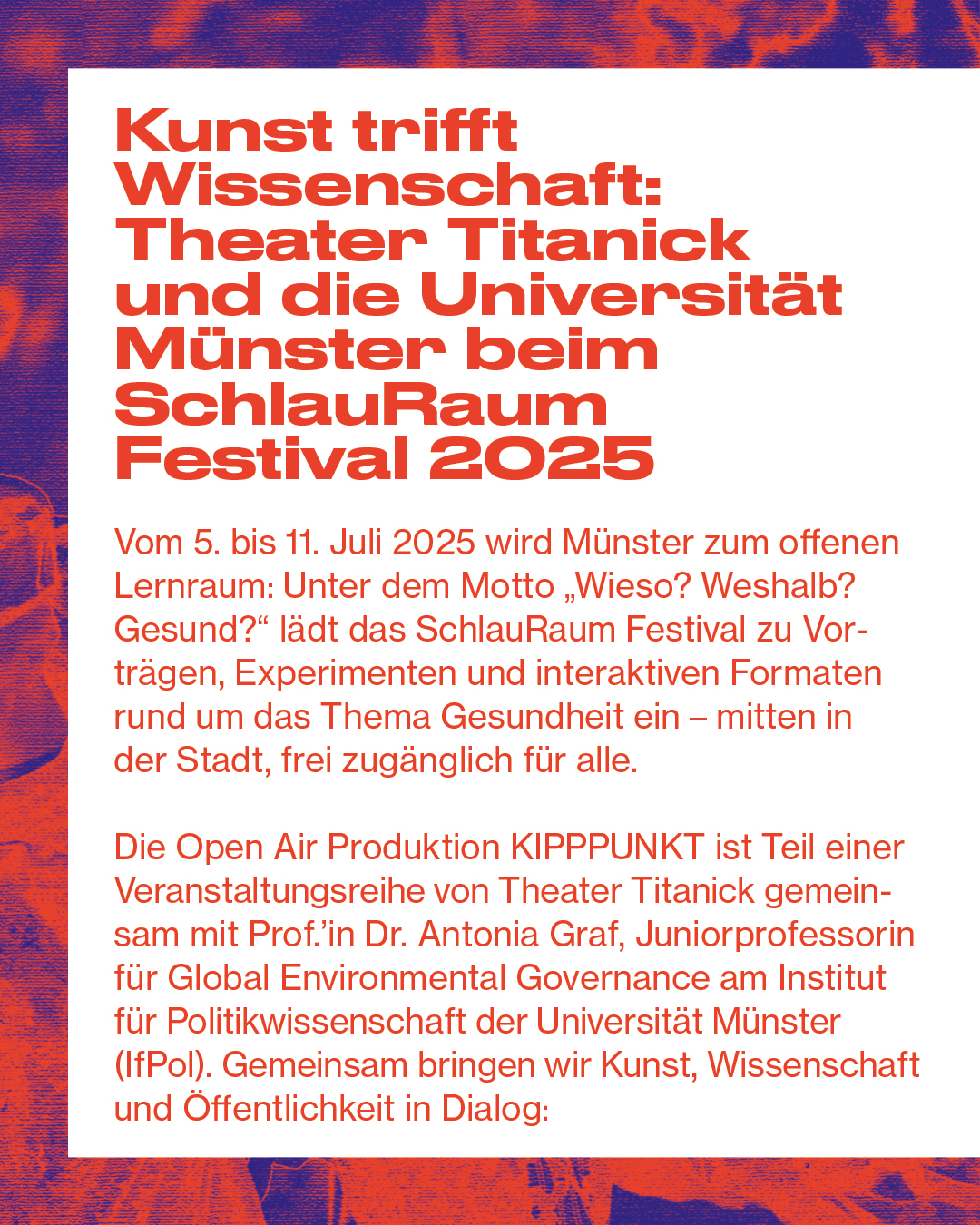 Seit fast 36 Jahren entwickeln wir Theater im öffentlichen Raum – in Münster und weltweit. Unsere Produktionen wurden in 32 Ländern auf vier Kontinenten gezeigt und haben hunderttausende von Menschen begeistert. Mit dem internationalen FLURSTÜCKE Festival bringt Titanick gemeinsam mit dem Theater im Pumpenhaus, der Filmwerkstatt Münster und der Kunsthalle Münster alle vier Jahre Theater, Tanz, Performance und Kunst nach Münster
