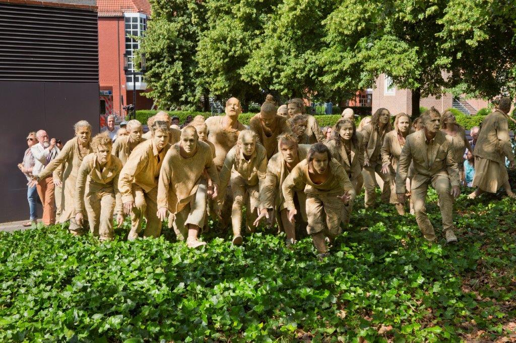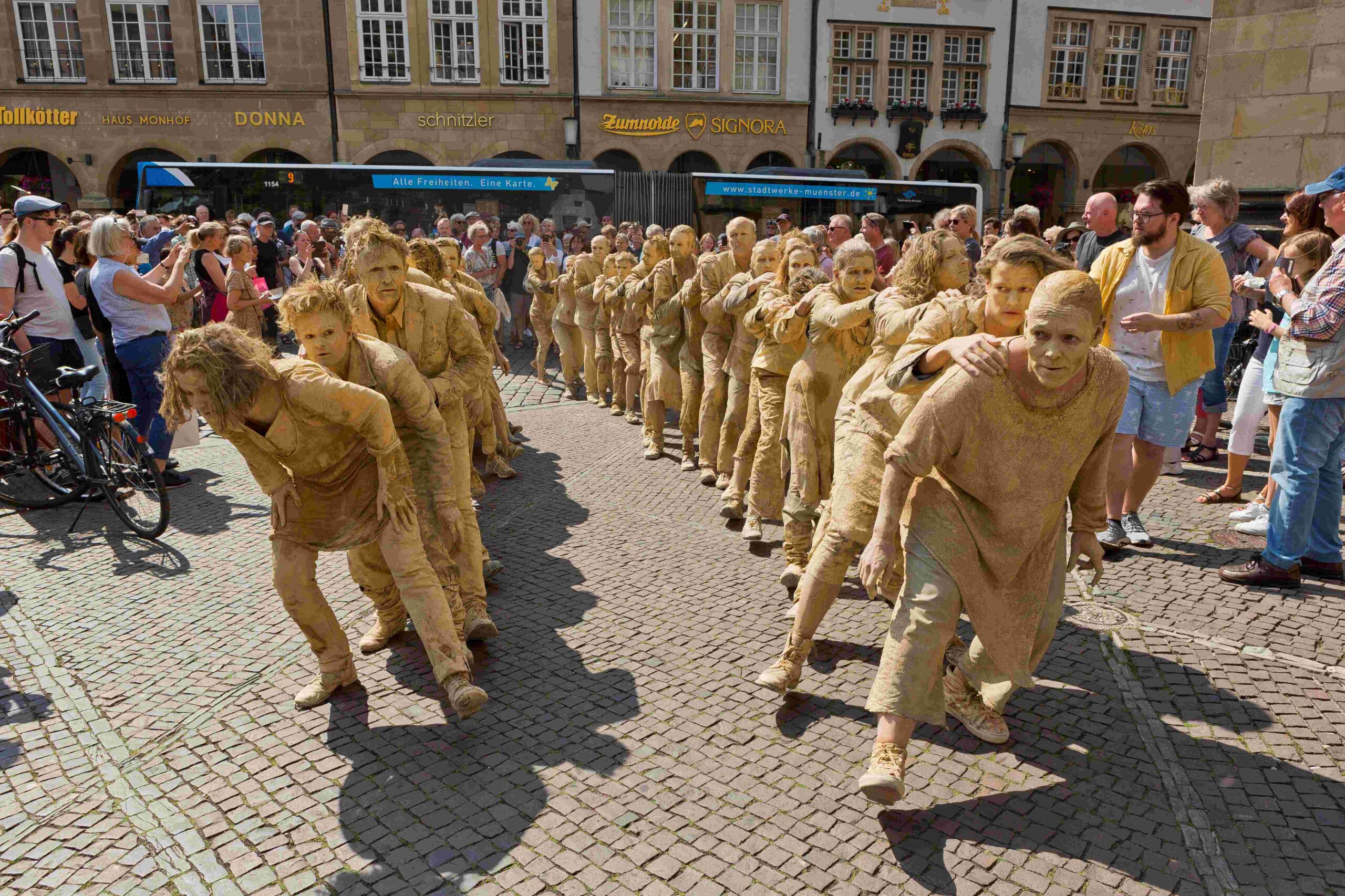 Mit Erdkrusten bedeckt, erwachen sie inmitten der Stadt zum Leben und tasten sich vorsichtig durch ihre neue Umgebung. Sie erkunden die Stadt aus einer vollkommen neuen Perspektive. Vielleicht sind sie verschütteten Erinnerungen entstiegen, womöglich den verblichenen Fotografien aus den Alben der Großeltern. Sie streifen durch die Gassen, interagieren mit Passant*innen und lauschen den Straßen Erfahrungen ab – sie durchleuchten in einer ausschwärmenden Stadtraum-Choreographie die Sedimente der Geschichte. Finden die Erdmenschen wieder, was wir verloren haben?